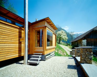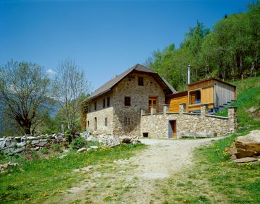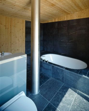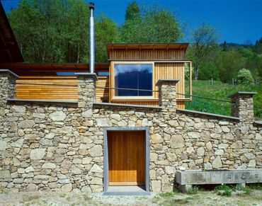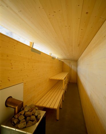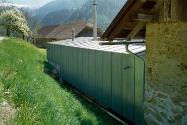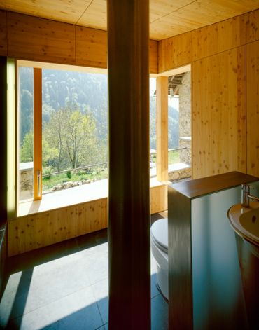 Sanitäre Einrichtungen hat es innerhalb von Bauernhäusern dieser Art nicht gegeben. Dennoch war dem Wunsch nach einem beheizten Bade- und Toilettenraum zu entsprechen. Das alte Haus wurde in seiner Struktur erhalten, renoviert, und die neuen Funktionen in einem Annex angefügt. Die acht Meter lange Distanz von der ehemaligen Speckkammer zum neuen Badehaus überbrückt ein eineinhalb Meter breiter Verbindungsgang. Diese Brücke ist Sauna, der Kopfbau birgt ein Waschbecken, eine Badewanne und eine Humustoilette. Ein grosses Schiebefenster ermöglicht bei allen Verrichtungen Aus- und Talblick. Steinplatten aus der eigenen Alm schützen Boden und Wandteile, dazu Lärchenholz für Decke, Wände und Fenster. Hinter der wieder errichteten Bruchsteinmauer verbirgt sich ein neugeschaffener Kellerraum. Tages- und Mondlicht fallen durch bodenebene Glasschlitze, die unter der Brücke liegen, ein.
