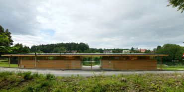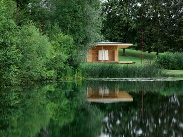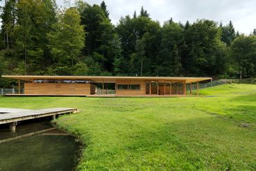Der Aichwaldsee, umgeben von Wiesen und Wald, umrahmt durch Schilf, ist kaum durch zu nahe gerückte Bauten gestört und somit als einer der wenigen Kärntner Seen sehr ursprünglich in seiner Wirkung. Diese Natürlichkeit soll erhalten bleiben. Daher wird das neue Badehaus über dem Boden schwebend am südlichen Rand des Areales gesetzt, um dort als Empfangsgebäude zu fungieren, und die Richtung See abfallenden kleinräumigen Wiesen unberührt den Badenden zu überlassen. Der „Pfahlbau“ als liegendes Volumen zeichnet die Horizontale der Wasserfläche nach. Weit ausladende Dächer gewähren Schutz, Stege, Stiegen und Sitzstufen animieren lebhafte Nutzung.