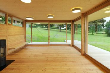 Beton-Pfahlgründung, aufgehende Bauteile in Massivholz. Wirtschaftlicher Stützenraster von 2,5 x 5 Metern. Bodentragwerk: Lärchenholzrost, Brettsperrholz Fichte, Bodenaufbau; Stegbelag in Lärche massiv. Dachtragwerk: kragt längsseitig nach Norden 2,5 Meter aus, Deckenuntersicht Brettsperrholz in Fichte, sichtbar, darüber mit diesem verbunden Leimholzträger in Fichte, Sekundärträger Fichte, Dämmung, Dachschalung, Sarnafil (PVC-frei). Wandtragwerk: Lärchenholzsteher, dazwischen Dämmung, Innen- und Aussenwandverkleidung Lärche massiv, unbehandelt. Fenster und Türen: Lärchenholz, geölt. Dreiseitig umlaufende Oberlichtverglasung, Hebeschiebetüren über Eck, raumhoch.