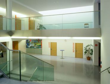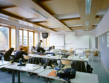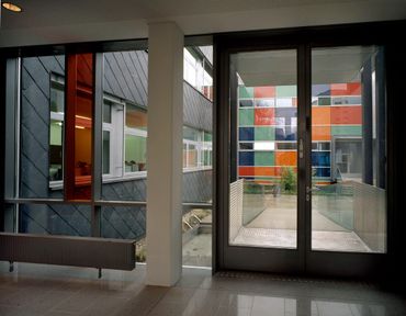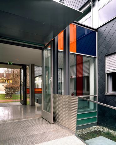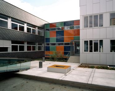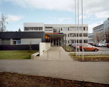 Sanieren heisst entdecken. Im Zuge der Planung und Bestandserhebung offenbarte sich ein grösserer als der angenommene und als notwendig erachtete Umgestaltungsaufwand. Diese Tatsache ermöglichte es, den Bestand neu zu organisieren. Die unterschiedliche Bekleidung der Bauteile verdeutlicht deren unterschiedliche Alter. Der silbrig bis graphiten schimmernde Schiefer nimmt die Schultrakte gegenüber dem Grünraum zurück; die zwei Baustufen des dreigeschossigen Traktes erscheinen in unterschiedlichen Grautönen. Die Schwellenbereiche der Verbindungselemente, radikal geöffnet, kontrastieren farbig; hier tritt innen und aussen in Resonanz. Mit einer Vielzahl an Massnahmen wurde der düster wirkende Bestand in eine helle Schule von hohem Aufenthaltswert verwandelt, in der Kunst integrierender Bestandteil ist.