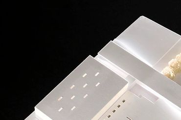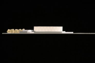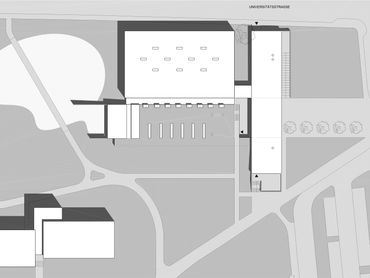 Die Gesamtkomposition beabsichtigt die räumliche Fassung des Kreuzungsbereiches, die bauliche Führung der Wegediagonale zum Haupteingang der Universität sowie die städtische Strassenraumbildung entlang der Universitätsstrasse. Die drei Funktionsbereiche sind gestaltgebend: die Dreifachturnhalle, das größte Volumen, steht parallel zur Universitätsstraße, über eine transluzente Haut vermittelt sich ihre Konstruktion nach außen; parallel zur Halle, mit Erdreich überdeckt, die Garderoben; quer dazu ein etwas höher gelegter Büro- und Eingangstrakt, unter diesem ein gedeckter Hof vor dem Garderobeneingang. Den Abschluss des Garderobentraktes bildet der Krafttrainingsraum, als schwebende Plattform über dem Seerosenteich.