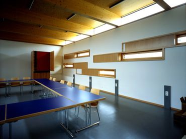Geradlinige rechtwinkelige Geometrien bestimmen das Bauwerk. Die Vorstellung von einem übersichtlichen, sehr einfach funktionierenden Betrieb, und der extrem enge Kostenrahmen (eine preisgünstigere Feuerwehr ist nicht bekannt) bestimmten die Wahl der architektonischen Mittel. Trotz limitierter Formensprache und Materialwahl ist ein vielfältiges, lichtdurchflutetes und spannendes Raumgefüge von hoher Funktionalität entstanden. Spannung erzeugt der Wechsel von verschieden proportionierten Volumen: auf hohe Räume (zB mehrgeschossig und vertikal begehbar wie die Eingangshalle) folgen tiefe, langgezogene Räume. Direktes, indirektes, Streiflicht und Licht von oben wechseln je nach Raum.
