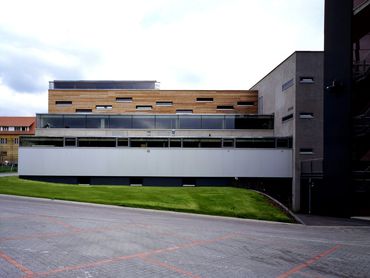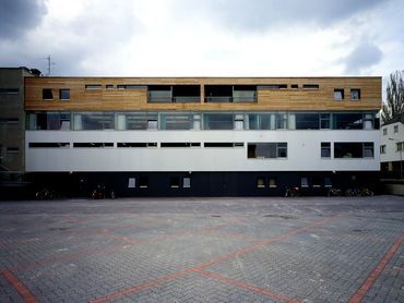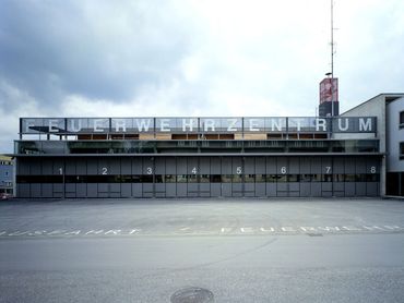 Die Komposition aus einzelnen Elementen wird ablesbar durch die klare Zuordnung jeweils eines Materials: schwer und robust der Betonsockel und die Fahrzeughallen; leicht, die eingebaute Technologie vermittelnd, der in die Eingangshalle eingeschobene, wellblechverkleidete Kubus der Einsatzleitzentrale; durch die umlaufenden Glasbänder scheinen die Holz-Fertigteilkonstruktionen über beiden Flügeln zu schweben. Entsprechend dem abnützungsintensiven Gebrauch wurden robuste und pflegearme Materialien wie roher Beton, Metallgitterroste, OSB-Platten und ungehobelte Lärchenbretter verwendet.